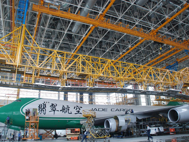 應用于飛機制造工廠、飛機維修機庫、飛機噴漆機庫、飛機拆解機庫,適配A380、A330、B747、B787、C919、C929、Y20等全系列飛機,更大跨度90米,最多7支點。